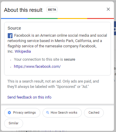 The information includes a blurb about what the website links to, including Wikipedia information, but if that isn’t available it provides Google’s own analysis as the site was last indexed. It also provides information about the website’s security.