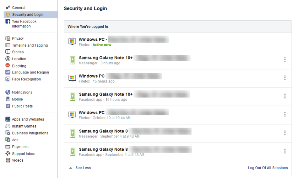 Facebook will show you all of the devices you are currently logged into. Some of these will be a surprise. It will show you where your device was last used, the device that was used, and the browser type if applicable. You’ll want to think about all the devices you’ve accessed your Facebook on before jumping to the conclusion that you’ve been hacked. The longer you have been an active user, the more devices you’ve accessed your Facebook on; and, if you haven’t logged out of the account on that device it will show up here.