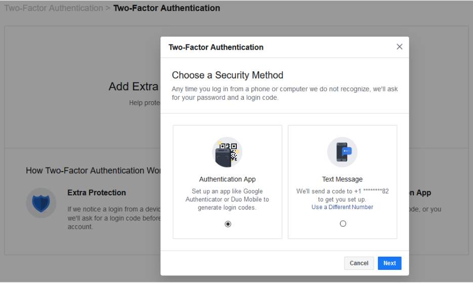 Then, from Facebook on your computer (see the above screenshot), select Authentication App and click Next.